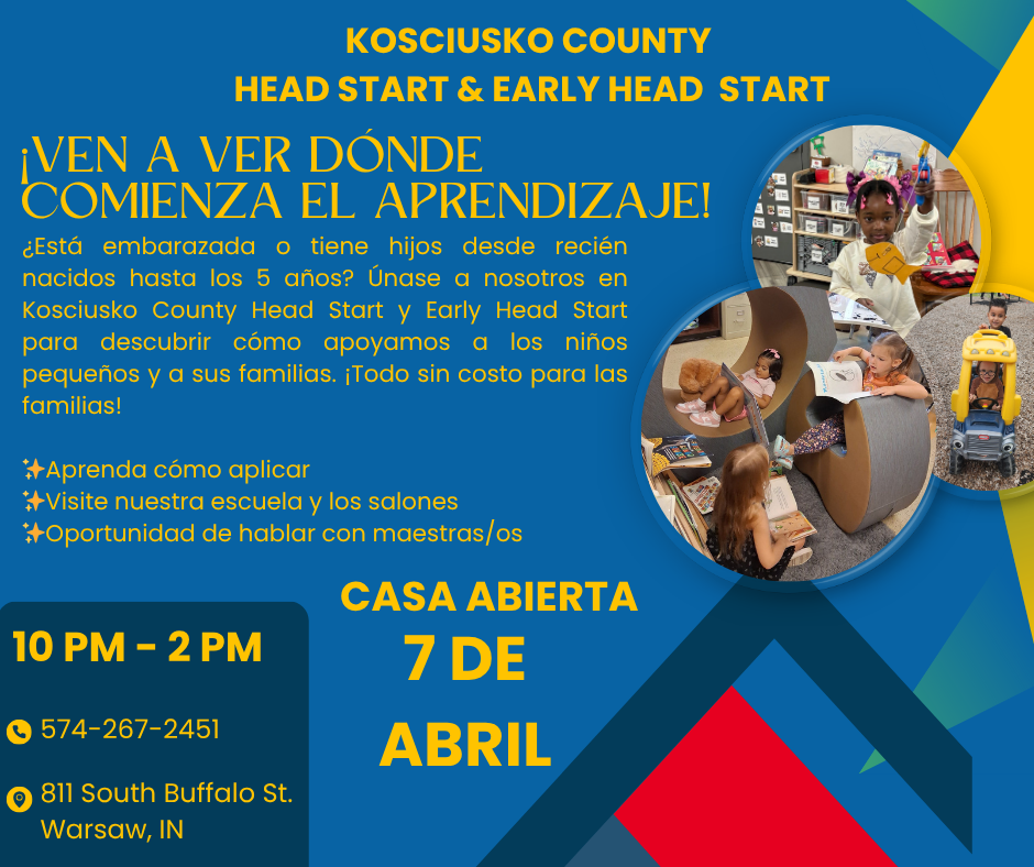 Kosciusko County Head Start & Early Head Start is hosting an Open House on April 7 from 10 AM – 2 PM. Families can tour classrooms, meet teachers and learn how to apply. Free support for children ages 0–5 and their families.